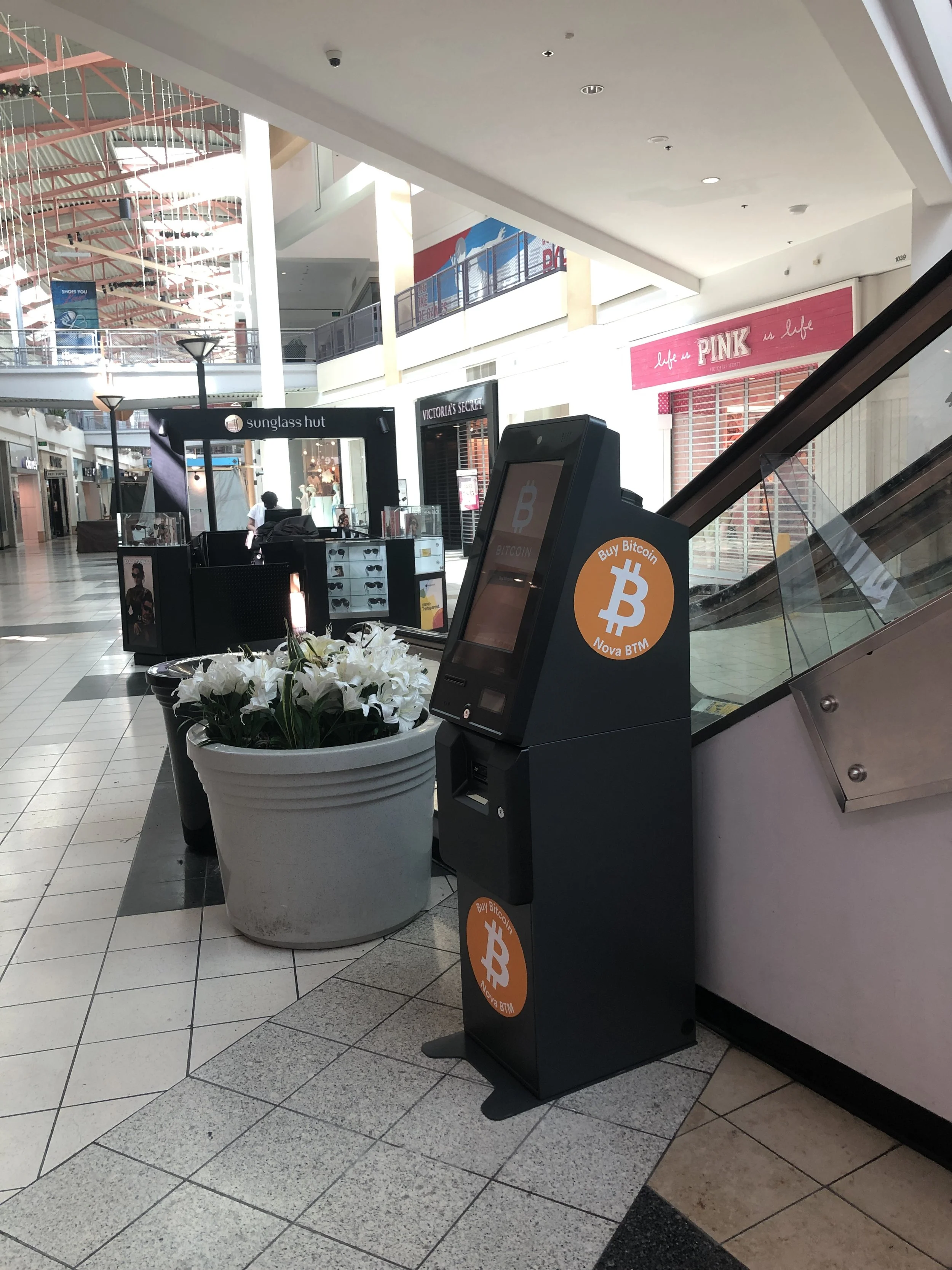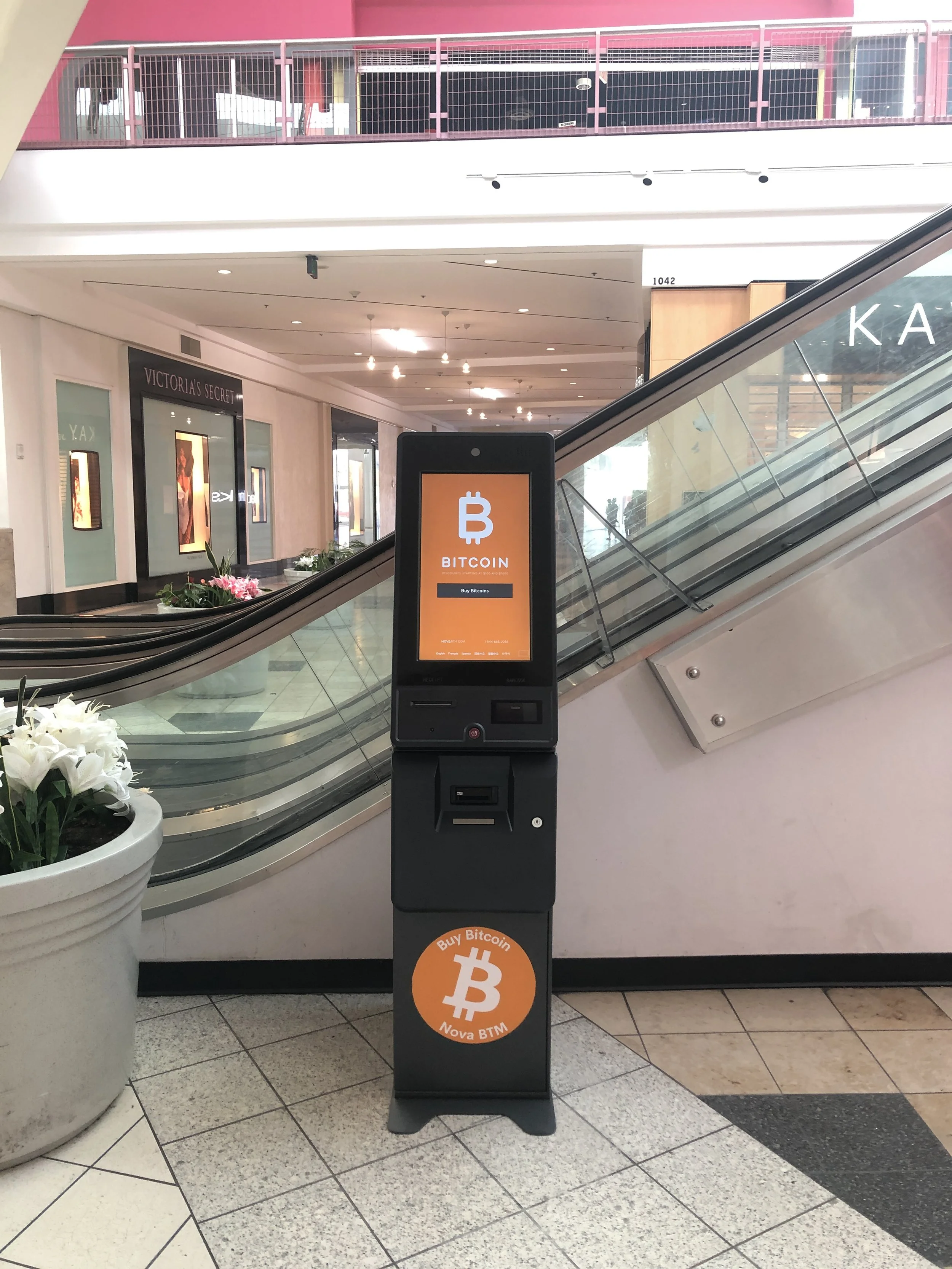 Bitcoin ATM is located on the lower level against the escalator near Victoria’s Secret and Express.